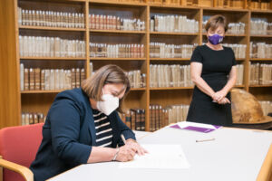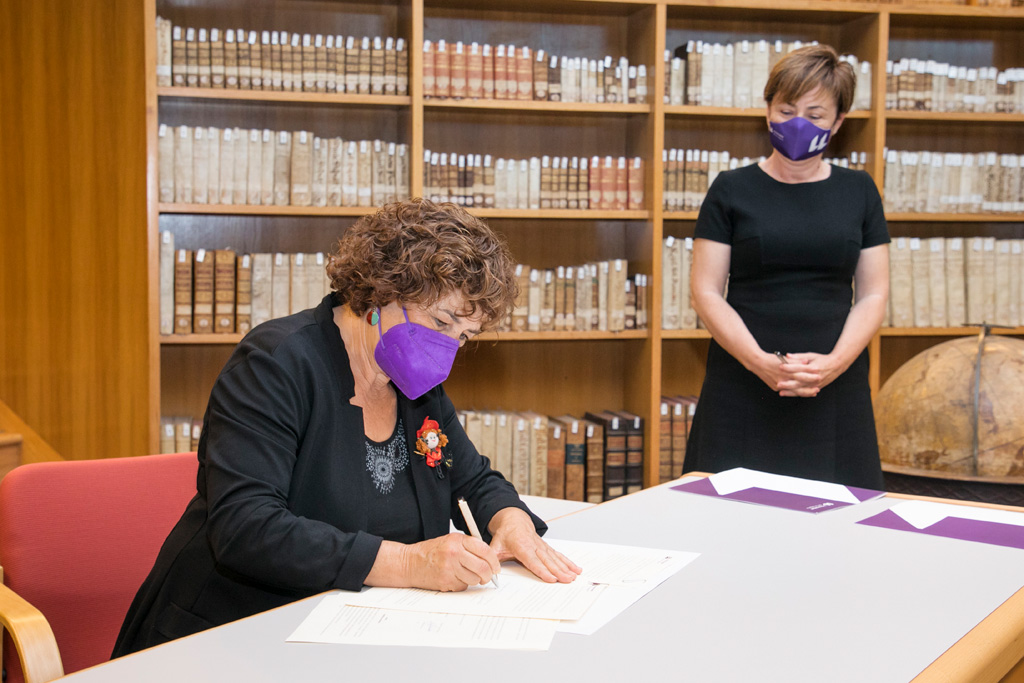 La donación del Colectivo Harimaguada fue firmada por María Dolores González Díaz, quien vino acompañada por otra íntegramente del grupo, María del Carmen Bolaños Espinosa. Señaló que la donación reúne el trabajo “altruista” de más de cuatro décadas ahondando en el conocimiento necesario para lograr una educación afectivo-sexual “más satisfactoria, saludable y placentera”, fondo que está ahora a disposición de todos los usuarios de la biblioteca universitaria.