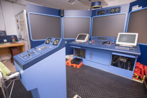 La sala de máquinas de un buque carece de ventanas. Por eso aquí tampoco las hay. Está oscuro y a una temperatura más baja de lo normal a la que el alumnado tiene que acostumbrarse. No puede ver a los profesores, pero estos a ellos sí. Lo hacen para comprobar cómo actúan, cómo reaccionan ante situaciones cotidianas o adversas. Es una recreación de lo que van a encontrarse en la sala de control de un barco. Es, ni más ni menos, la vida real.