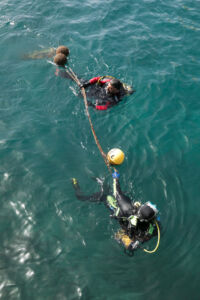 Toca a profesores y alumnos meterse en el agua fría, pero antes hay que ponerse el traje de neopreno que está en un cuarto anexo al muelle, y que es enorme y pesado como un plomo. Da igual que la persona que se vaya a embutir en él sea delgada o menuda. Son los homologados por la OMI, así que hay que llevarlo sí o sí. La ventaja es que además de evitar que uno se quede pajarito a causa del agua fría, se queman calorías extra se quiera o no. Y eso es un plus.