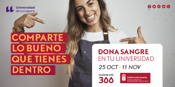 El Instituto Canario de Hemodonación y Hemoterapia (ICHH) acaba de publicar la campaña de donación de sangre en la Universidad de La Laguna, que se desarrollará a partir de la próxima semana, desde el lunes 25 de octubre, y hasta el 11 de noviembre. A diferencia de otros años, las colectas se realizarán en las distintas salas ofrecidas por facultades y escuelas dado que, debido a la pandemia, las unidades móviles no estarán operativas.
