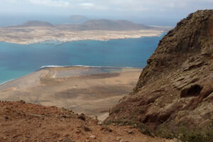 Salinas del Río en la base del escarpe de Famara (Lanzarote) y al otro lado la isla de La Graciosa donde se ha descubierto el depósito de oleaje de época Romana. / Inés Galindo
