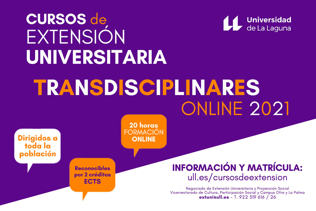La Universidad de La Laguna, a través del Vicerrectorado de Cultura y Participación Social, ha publicado el programa de cursos de extensión universitaria “Transdisciplinares online 2021”, que este año consta de 15 cursos reconocibles por dos créditos ECTS cada uno. La matrícula comenzará el próximo lunes 8 de febrero.