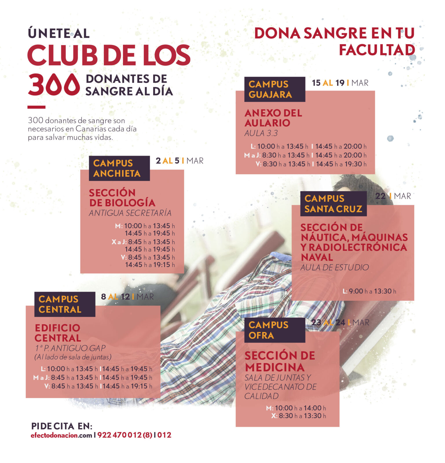 El Instituto Canario de Hemodonación y Hemoterapia, organismo dependiente de la Consejería de Sanidad del Gobierno de Canarias, y la Universidad de La Laguna han organizado durante el mes de marzo una nueva campaña de donación dirigida a toda la comunidad universitaria.