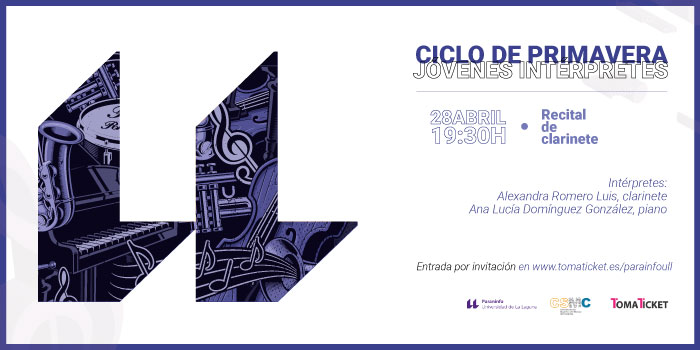 Mañana, 28 de abril, la clarinetista Alexandra Romero, en compañía de Ana Lucía Domínguez al piano, tomará el escenario del Paraninfo para brindar al público un recital de clarinete. Entre las piezas que interpretará destacan la sonatina para clarinete y piano de Joseph Horovitz, el solo de concurso de André Messager o el concierto nº2 de Bernhard Henrik Crusell. Romero ha realizado sus estudios musicales en el Conservatorio Profesional de Música de Santa Cruz de Tenerife y posteriormente en el Conservatorio Superior de Música de Canarias, donde actualmente continúa formándose. Ha participado en festivales como el Tenerife Clarinet Fest y ha tomado clases con los clarinetistas Luis Gómez, Spyros Mourikis y Cristo Barrios.
