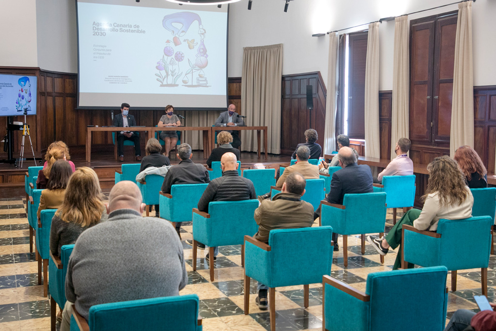 Previamente, el director general presentó las características principales de la Agenda Canaria de Desarrollo Sostenible 2030. El documento se estructura en cinco grandes dimensiones interconectadas: tres se refieren a las diferentes vertientes de la sostenibilidad, que sería la Prosperidad (sostenibilidad económica), las Personas (sostenibilidad social) y el Planeta (sostenibilidad ambiental). A ellas se añade una cuarta dimensión, la Gobernanza Pública y, finalmente, el Patrimonio Cultural.