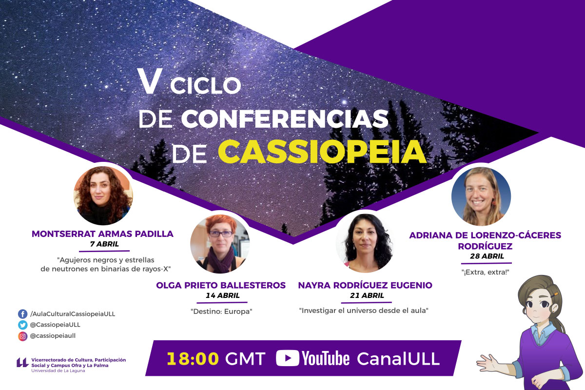 El Aula Cultural Cassiopeia de la Universidad de La Laguna, centrada en la divulgación de la astronomía, inaugura mañana, miércoles 7 de abril, su V Ciclo de Conferencias de Cassiopeia, un evento que por las particulares circunstancias sanitarias se desarrollará por primera vez de manera íntegramente virtual. En esta ocasión, contarán con cuatro ponentes expertas en el ámbito investigador: Montserrat Armas Padilla, Olga Prieto Ballesteros, Nayra Rodríguez Eugenio y Adriana de Lorenzo-Cáceres Rodríguez.