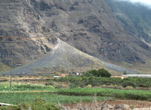 Fajana de Gorreta, en la isla de El Hierro. Este depósito de ladera, con la también característica forma en abanico ilustra perfectamente lo que en realidad es una “fajana”.