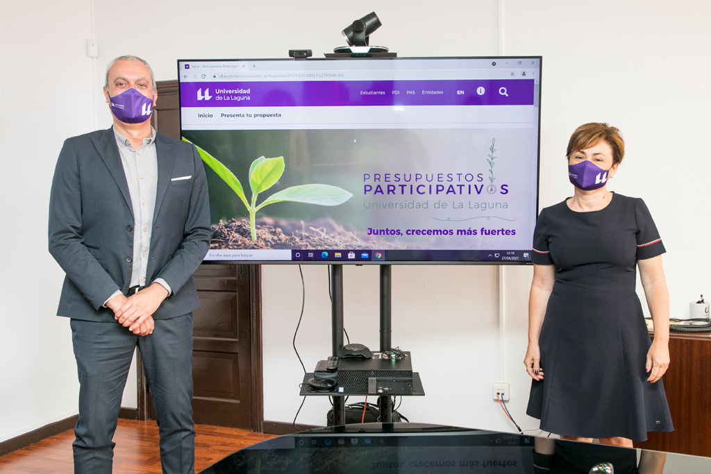 La rectora de la Universidad de La Laguna, Rosa Aguilar, y el gerente de la institución, Juan Manuel Plasencia, han presentado hoy, martes 27 de abril, en rueda de prensa la primera convocatoria de los Presupuestos Participativos del centro académico. Con esta nueva iniciativa, 450.000 euros de las cuentas del próximo año se destinarán a las propuestas que presenten hasta el 11 de junio las personas que conforman la comunidad universitaria.
