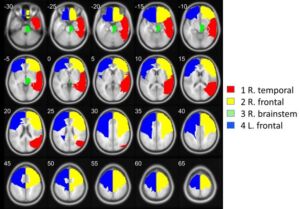 Cortes axiales con los lóbulos cerebrales con mayor diferencia de materia gris entre grupos. El lado derecho de la imagen corresponde al lado derecho del cerebro.