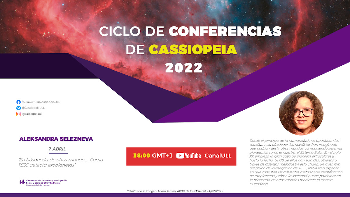 El Aula Cultural Cassiopeia de la Universidad de La Laguna ha organizado la sexta edición de su ciclo de conferencias, cuya primera intervención correrá a cargo de la integrante del grupo de investigación Transiting Exoplanet Survey Satellite (TESS) Aleksandra Selezneva, que se celebrará mañana, jueves 7 de abril, comenzando a las 18:00 horas y se retransmitirá a través del canal oficial de Youtube de la institución académica. En su ponencia “En búsqueda de los otros mundos: cómo TESS detecta exoplanetas”, Selezneva explicará los detalles del esta investigación en la que participa.