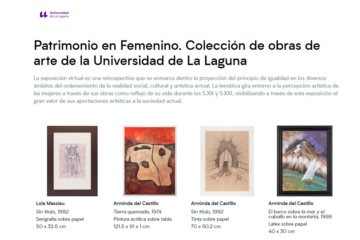 De cara a los usuarios externos, se ha habilitado una sección de la web que muestra parte de este catálogo, organizado en salas virtuales. La idea del vicerrectorado es ir mostrando el catálogo a través de varias estas salas virtuales que irá abriendo temporalmente, agrupando obras según criterios temáticos. Por ejemplo, actualmente una de ellas está dedicada a obra de autoría femenina.