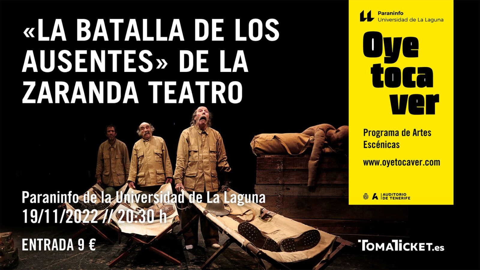 Oye Toca Ver es un proyecto configurado como una temporada de artes escénicas que incluye más de un centenar de funciones de espectáculos canarios, nacionales e internacionales entre el 7 de octubre y el 26 de marzo, organizado conjuntamente por el Auditorio de Tenerife, la Universidad de La Laguna y los ayuntamientos de Adeje, Arona, Candelaria, El Sauzal, Guía de Isora, Los Realejos y Tacoronte. La conocida compañía Zaranda Teatro llevará al Paraninfo este sábado, 19 de noviembre a las 20:30 horas, la obra “La batalla de los ausentes”, cuyas entradas podrán adquirirse online al precio de 9 euros.