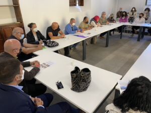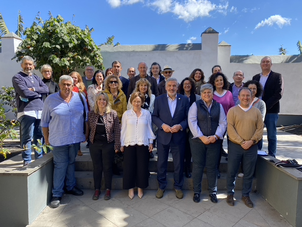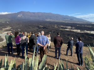 El trabajo iniciado por la mañana en la Casa Massieu continuó por la tarde con una visita de los consejos de dirección a la Montaña de La Laguna, mirador privilegiado desde donde pudieron conocer los detalles del proceso eruptivo de Cumbre Vieja y sus principales repercusiones en el asentamiento, la movilidad y la actividad económica del Valle, entre otros aspectos. También se compartió la experiencia obtenida en la gestión de la emergencia y lo que está suponiendo el regreso de las familias que mantienen sus domicilios en distintos barrios de la comarca afectados por el volcán. Asimismo, se observaron algunas de las actuaciones puestas en marcha para conectar por carretera distintos enclaves poblados y áreas de cultivo.