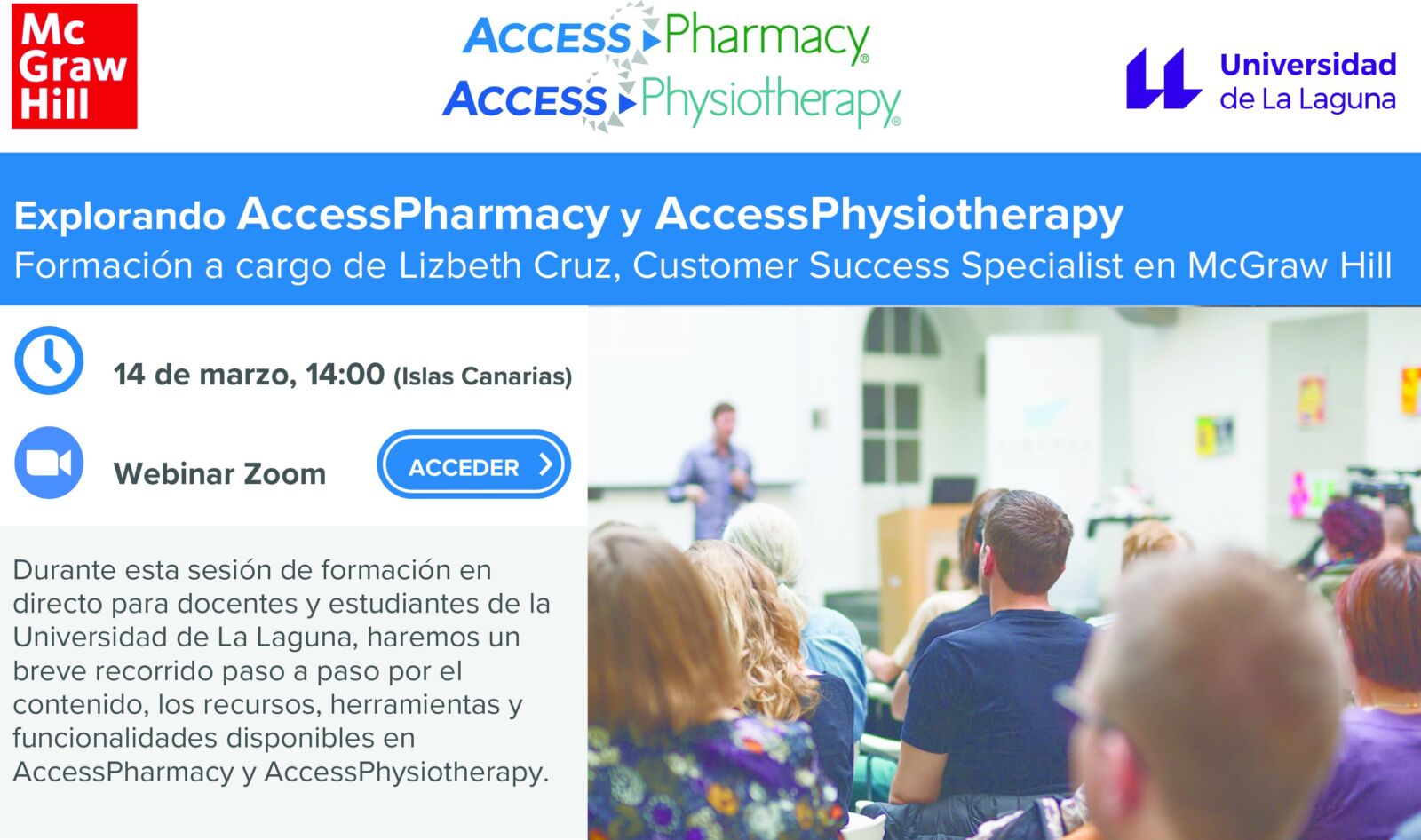 El próximo lunes 14 de marzo, a las 14:00 h. se celebrará el seminario en línea “Explorando Access Pharmacy y Access Physiotherapy”, las dos nuevas bases de datos que la Universidad de La Laguna pone a disposición de PDI y estudiantes del área de Ciencias de la Salud.
