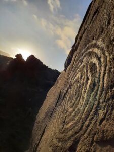 Durante el solsticio y al atardecer, tal y como se aprecia en la foto, el sol al descender proyecta su luz por el hueco que se ve en la silueta de la montaña e ilumina la roca grabada con la espiral. Por eso, los antiguos palmeros eligieron estas rocas del barranco, y no otras, para dejar su huella, porque justo allí «Magec», el sol, proyectaba y sigue proyectando su luz al atardecer y sigue anunciando la llegada del verano.