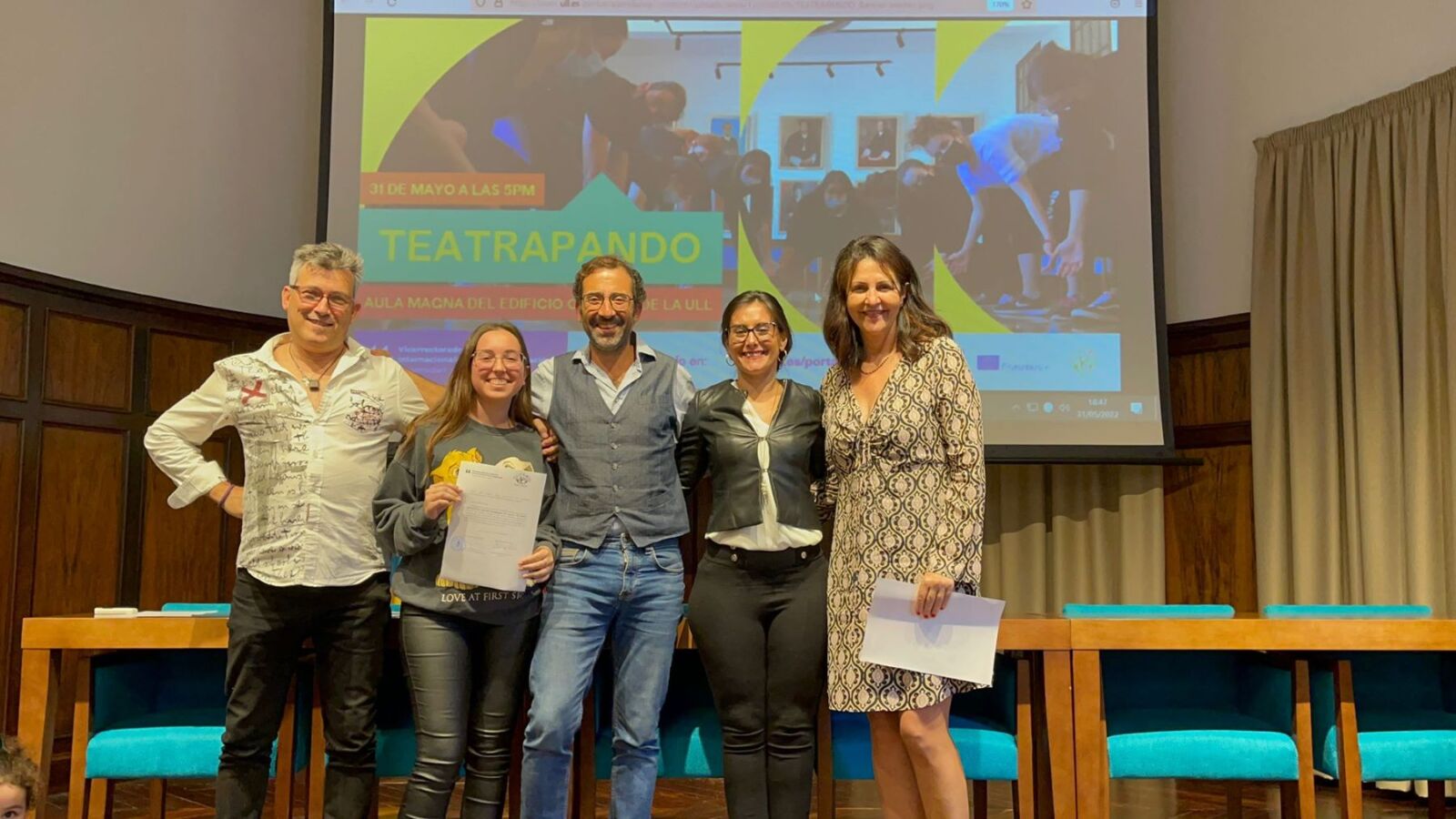 La vicerrectora de Proyección, Internacionalización y Cooperación, Lidia Cabrera Pérez, y la coordinadora del proyecto Erasmus ‘My Cultural Heritage, My Future’, Manuela Di Folco, han entregado recientemente los diplomas a los estudiantes participantes en el taller ‘Teatrapando’ celebrado a lo largo del cuatrimestre y promovido para fomentar valores interculturales entre los estudiantes haciendo uso del teatro. En el acto también estuvieron presentes la directora de Movilidad Europea e Internacionalización en casa, Sandra Dévora Gutiérrez, y los profesores del taller José María del Castillo Olivares y Andrés González Novoa.
