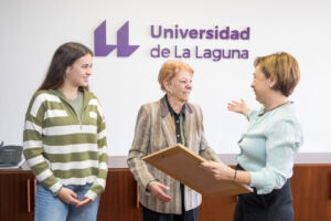 La rectora de la Universidad de La Laguna, Rosa Aguilar, ha recibido hoy 22 de diciembre a las protagonistas de la campaña promocional de mujeres científicas, la profesora de Química Física ya jubilada Gloria Pastor, de 90 años, y la alumna de segundo año del Grado en Ingeniería Electrónica Industrial y Automática, Natalia Méndez, que acaba de cumplir 19. Aguilar agradeció la participación desinteresada de ambas en la acción promocional, al tiempo que las obsequió con un recuerdo gráfico de esta iniciativa.