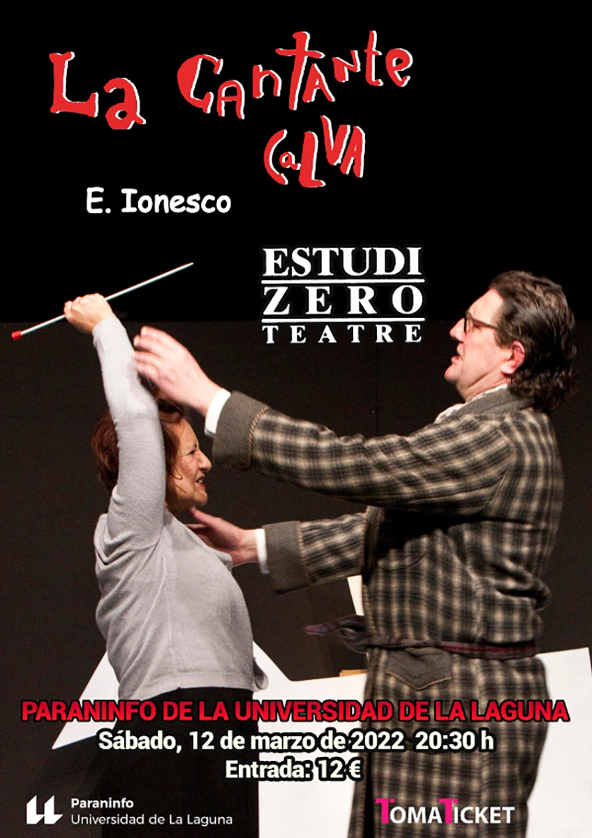 La cantante calva cartelLa compañía balear Estudi Zero Teatre presenta mañana, sábado 12 de marzo a las 20:30 horas en el Paraninfo de la Universidad de La Laguna, su montaje de la obra de Eugène Ionesco “La cantante calva”, una de las piezas claves del así llamado “teatro del absurdo”. Las entradas pueden adquirirse en la plataforma Tomaticket a un precio de 12 euros.