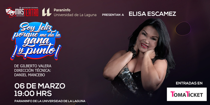 El domingo 6 de marzo a las 19:00, la veterana actriz venezolana Elisa Escámez presentará “Soy feliz porque me da la gana, y punto”, monólogo en el que se presenta las vivencias de una mujer cuando creía que la felicidad dependía de sus parejas y reflexiona sobre los beneficios de tener o no tener marido. Un espejo donde más de una mujer, y quizás algunos hombres, se verán reflejados en este espectáculo lleno de sabiduría cotidiana y mucha agudeza femenina.