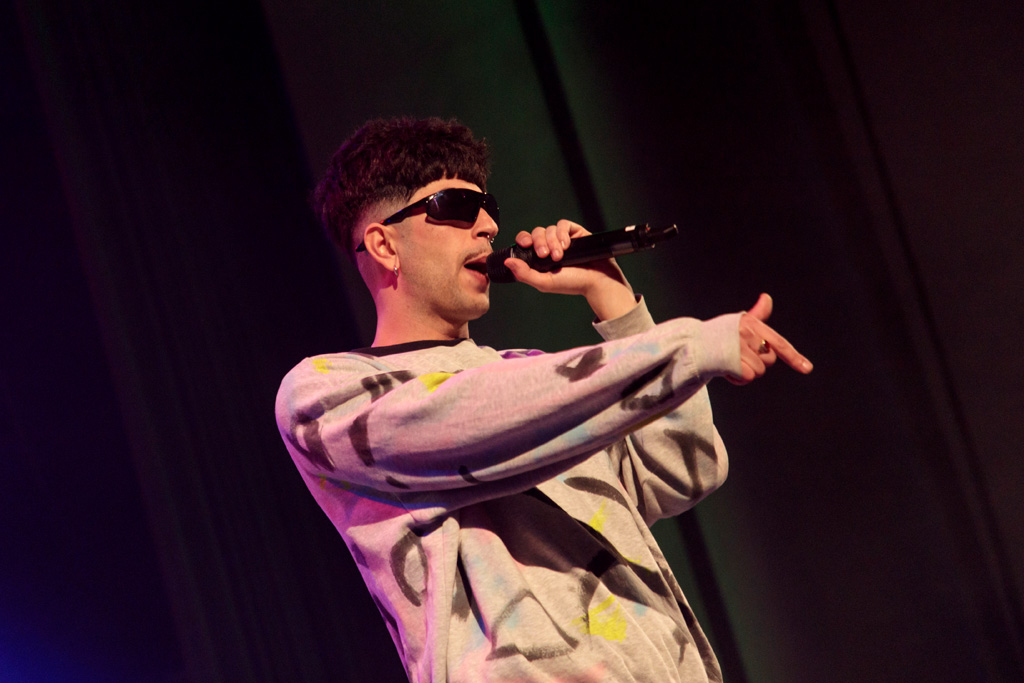 No es habitual que el público del Paraninfo de la Universidad de La Laguna se levante de las butacas para brincar al son de la música, ni tampoco que el artista sobre el escenario lance cruasanes de chocolate a los espectadores o rapee mientras dibuja en un caballete. Todo eso ocurrió anoche, jueves 3 de marzo, en el ‘showcase’ que Bejo ofreció en el recinto universitario como parte del LL Urban Fest Ciudad de La Laguna.