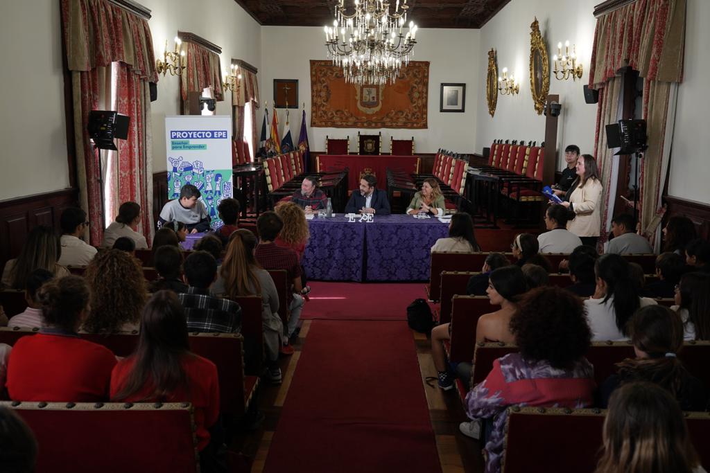 Un grupo de estudiantes de diferentes centros educativos acudió al Ayuntamiento de La Laguna el pasado martes 25 de abril, en representación de todo el alumnado de la X edición del Programa ‘Enseñar para Emprender’ (EPE), para participar en el acto de solicitud de permiso de venta necesario para participar en la Feria de Cooperativas Escolares, y en el que está implicada la Universidad de La Laguna.