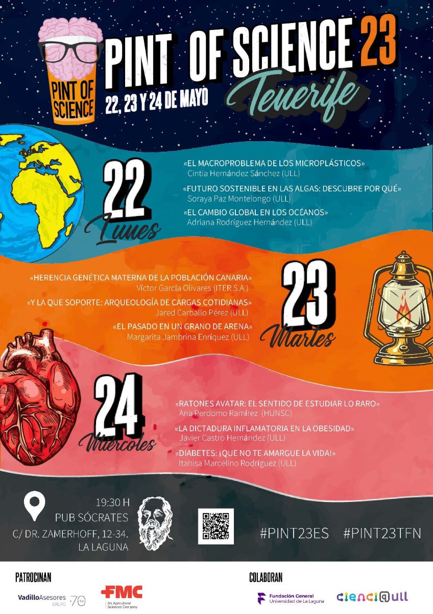 España se sitúa como el segundo país con más participación del mundo, de los 26 que se han unido a esta iniciativa. La edición de La Laguna se celebrará en el bar Sócrates, ubicado en la calle Dr. Zamenhoff, que acogerá nueve charlas repartidas en tres días, que abordarán asuntos tan de actualidad como la contaminación por microplásticos, la investigación en enfermedades raras, la herencia genética aborigen en los actuales canarios o el cambio climático. Es un evento totalmente gratuito cuyo programa se puede consultar en la web https://pintofscience.es/events/tenerife.