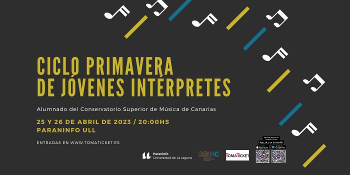 El Conservatorio Profesional de Música de Santa Cruz de Tenerife ha organizado dos conciertos de música de cámara titulados “Ciclo de primavera de jóvenes intérpretes” que se celebrarán en el Paraninfo de la Universidad de La Laguna los días 25 y 26 de abril a las 20:00 horas. Las entradas se podrán comprar en el mismo Paraninfo a un precio de 5 euros para el público general y de 3 euros para los estudiantes.