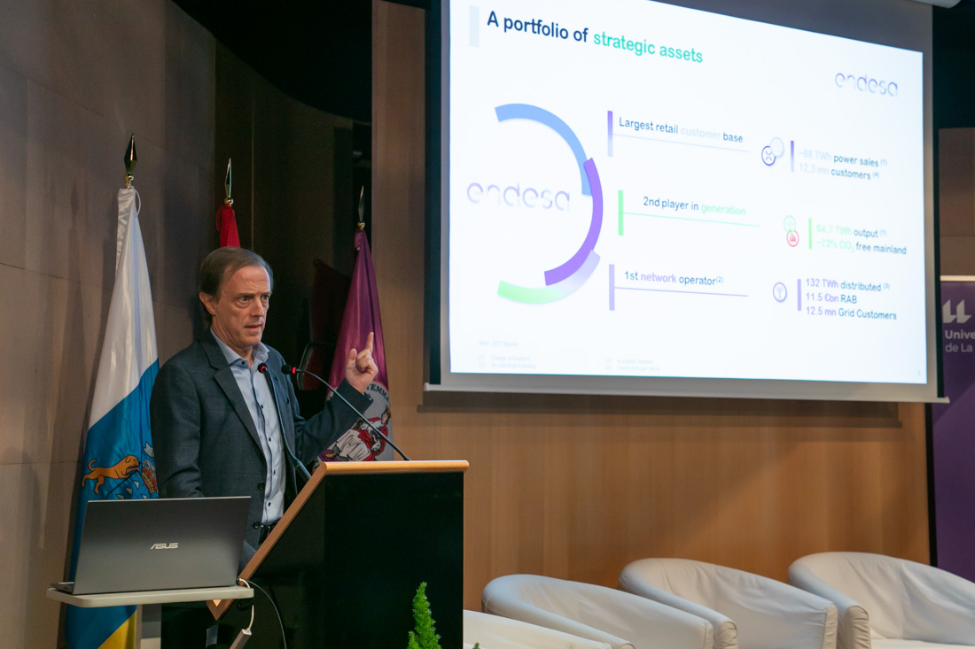 En cuanto a Canarias, varios operadores han intentado invertir en el territorio, pero ninguno salvo ENDESA lo ha conseguido, debido a severas restricciones legales. El archipiélago solo cuenta con un 20% de renovables, lo que se traduce en una elevada dependencia de combustibles fósiles. Por tanto, para conseguir la descarbonización total en 2040 hay que ir mucho más rápido, es necesario instalar 530 mw al año de nueva capacidad, manteniendo a la vez la energía térmica mientras que se construyen las renovables y los almacenamientos necesarios. Con todo, hay avances en distintas islas, destacando El Hierro, con una penetración del 50%. Los principales obstáculos que hay que remover son el aceleramiento de trabas administrativas, señalar cuáles son los suelos adecuados para ello, mejorar la falta de capacidad en las redes y renovar el almacenamiento. Para todo ello solo es necesario utilizar el 1,9% del suelo de Canarias, “por tanto es viable, económico y es urgente hacerlo”.