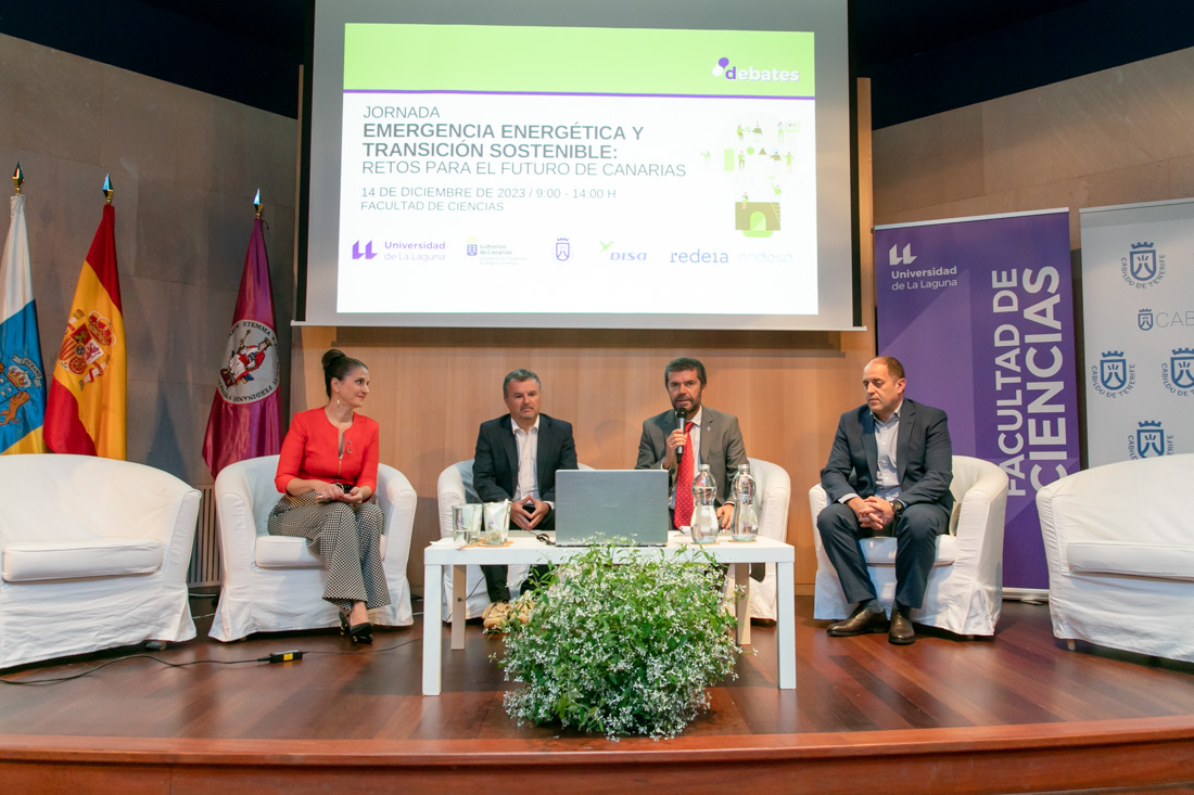La Universidad de La Laguna ha recuperado su ciclo de debates para tratar temas de actualidad social, aunando el conocimiento científico con las opiniones de responsables de la administración pública y del sector productivo. La emergencia energética y la transición sostenible ha sido el tema escogido hoy 14 de diciembre en una jornada desarrollada durante toda la mañana en la Facultad de Ciencias. La necesidad de acelerar el cambio a renovables, la urgencia de contar con sistemas de almacenamiento adecuados para descarbonizar la economía canaria y contar con combustibles de transición fueron las tres ideas más repetidas por todos los participantes en este foro.