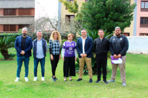 La rectora, en el centro de la imagen con la camisa del CD Laguna, acompañada su lado de Begoña López. jefa del Servicio de Deportes, y de José Ángel Torres, presidente del CD Laguna, junto a otros miembros de la directiva.