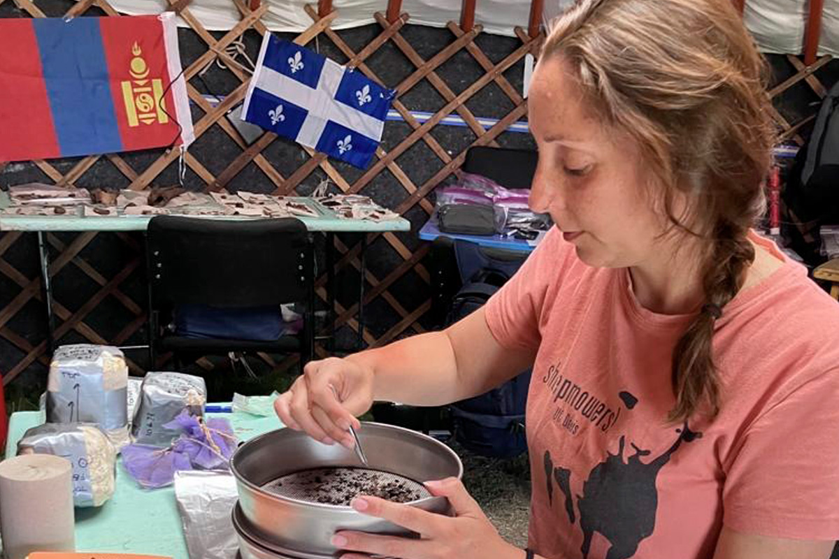 Natalia Égüez trabajando con muestras del yacimiento ZK513 en el laboratorio de campaña montado dentro de un ger o tienda mongola tradicional.
