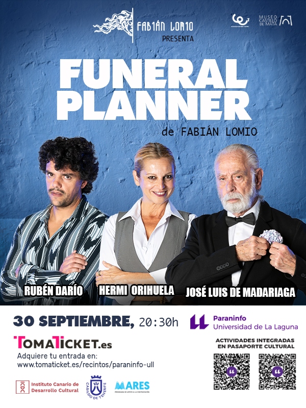El Paraninfo de la Universidad de La Laguna acoge mañana, sábado 30 de septiembre a las 20:30 horas, la representación de “Funeral Planner”, una tragicomedia de humor negro escrita por Fabian Lomio gracias al apoyo del programa Canarias Escribe Teatro, protagonizada por José Luis de Madariaga, Rubén Darío y Hermi Orihuela. Las entradas pueden adquirirse a través de la plataforma Tomaticket a un precio de 10 euros.