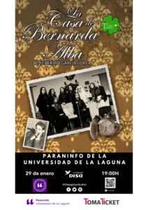 La compañía tinerfeña Timaginas Teatro vuelve a presentar en el Paraninfo de la Universidad de La Laguna su versión de “La casa de Bernarda Alba”, de Federico García Lorca. Este exitoso montaje, que forma parte del repertorio de la compañía desde 2013, será representado el próximo domingo, 29 de enero a las 19:00 horas, y sus entradas podrán adquirirse en la plataforma Tomaticket a un precio de 15 euros. La asistencia a este evento podrá validarse con la aplicación universitaria de Pasaporte Cultural.