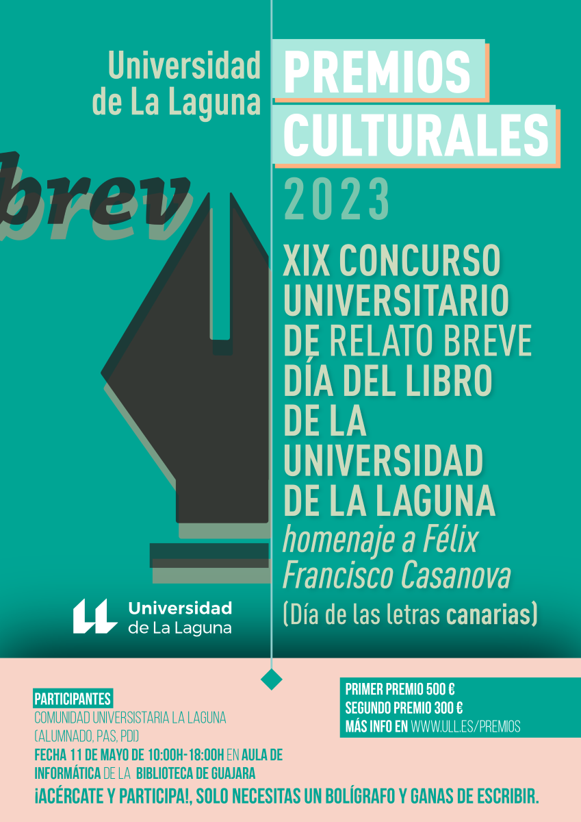 Uno de los premios culturales más consolidados de la Universidad de La Lagua es el que se organiza con motivo del Día del Libro, que en 2023 llega a su décimo novena edición. Tiene la particularidad de que los relatos participantes deben ser redactados a mano el mismo día del certamen en su sede de celebración. Este año la fecha elegida es el próximo jueves 11 de mayo en el Aula de Informática de la Biblioteca General y de Humanidades del Campus de Guajara, con un tramo horario para desarrollar los trabajos dispuesto entre las 10:00 y las 18:00 horas.