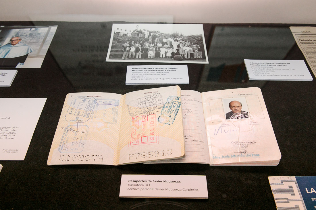 La exposición muestra documentos tan valiosos como varias cartas manuscritas, la propia tesis doctoral de Javier Muguerza, fotografías que atestiguan sus excelentes relaciones con intelectuales que le fueron contemporáneos, e incluso objetos con tan alto valor simbólico como su pasaporte, un documento que le fue retirado por las autoridades franquistas en 1957 y que no recuperaría hasta veinte años después, una vez fallecido el dictador.