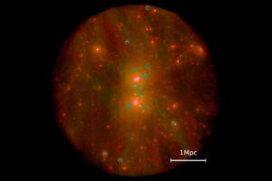 Una simulación numérica de nuestro grupo local de galaxias, desde el proyecto HESTIA. La distribución de materia oscura está representada en rojo, el gas en verde y las estrellas que componen las galaxias en blanco. Las dos galaxias centrales corresponden a nuestra Vía Láctea y a Andrómeda, mientras que las galaxias ultra-difusas que todavía no se han descubierto, están indicada con círculos verdes. Picture credit: Salvador Cardona-Barrero