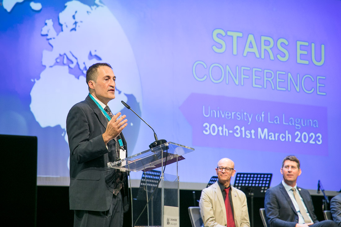 La alianza de universidades STARS EU está celebrando desde hoy, jueves 30 de marzo, su conferencia anual en la Universidad de La Laguna. Durante dos días, las instituciones adscritas a esta iniciativa que aspira a lograr el sello de “Universidad Europea” de la Comisión Europea, trabajarán conjuntamente en sus diferentes áreas de interés: investigación, intercambio estudiantil, titulaciones comunes y desarrollo local. El acto de apertura se ha celebrado en el Paraninfo, con el vicerrector de Innovación Docente y Calidad, Néstor Torres, en calidad de rector accidental.