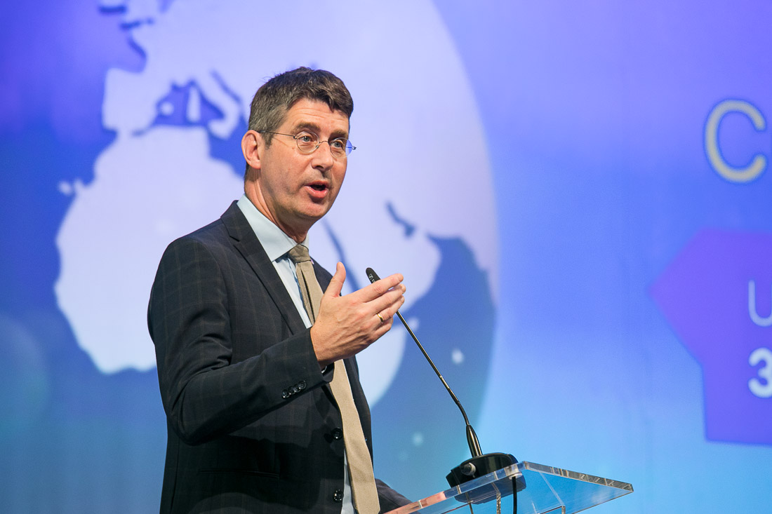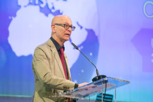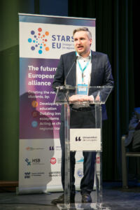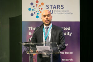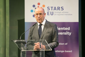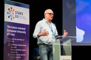 Seguidamente tomó la palabra Dick Pouwels, presidente de la institución que lidera la alianza, la Universidad de Ciencias Aplicadas de Hanze (Países Bajos), con una intervención que comenzó en tono irónico recordando que su país había sido invadido en diferentes momentos de la historia por España, Francia y Alemania, y que ahora todos ellos son países que forman parte de la alianza, lo cual ejemplifica el espíritu de colaboración que está detrás de STARS EU. Por ello, deseó que esta conferencia sirviera para generar la energía común necesaria para proseguir.