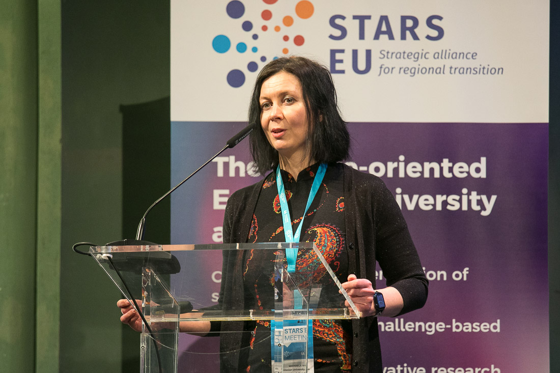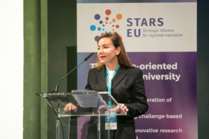 Una de las últimas incorporaciones a la alianza ha sido la albanesa Universidad Aleksander Moisiu de Dürres, cuya rectora, Kseanela Sotirofski, destacó la gran oportunidad que supone formar parte de STARS EU. “Somos un pequeño país pero una gran universidad”, señaló antes de manifestar su predisposición a ofrecer su mejor colaboración, así como su interés en aprender de la experiencia de las restantes instituciones. Puso especial énfasis en su interés por promover proyectos de cooperación en investigación, intercambio de estudiantes y establecimiento de titulaciones comunes.