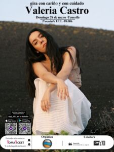 La cantautora palmera Valeria Castro trae al Paraninfo de la Universidad de La Laguna su última gira, titulada “Con cariño y con cuidado”, este domingo 28 de mayo a las 18:00 horas. Las entradas podrán adquirirse a un precio de 22 euros si se compran anticipadamente en la plataforma Tomaticket, y a 25 si se obtienen el mismo día en la taquilla.