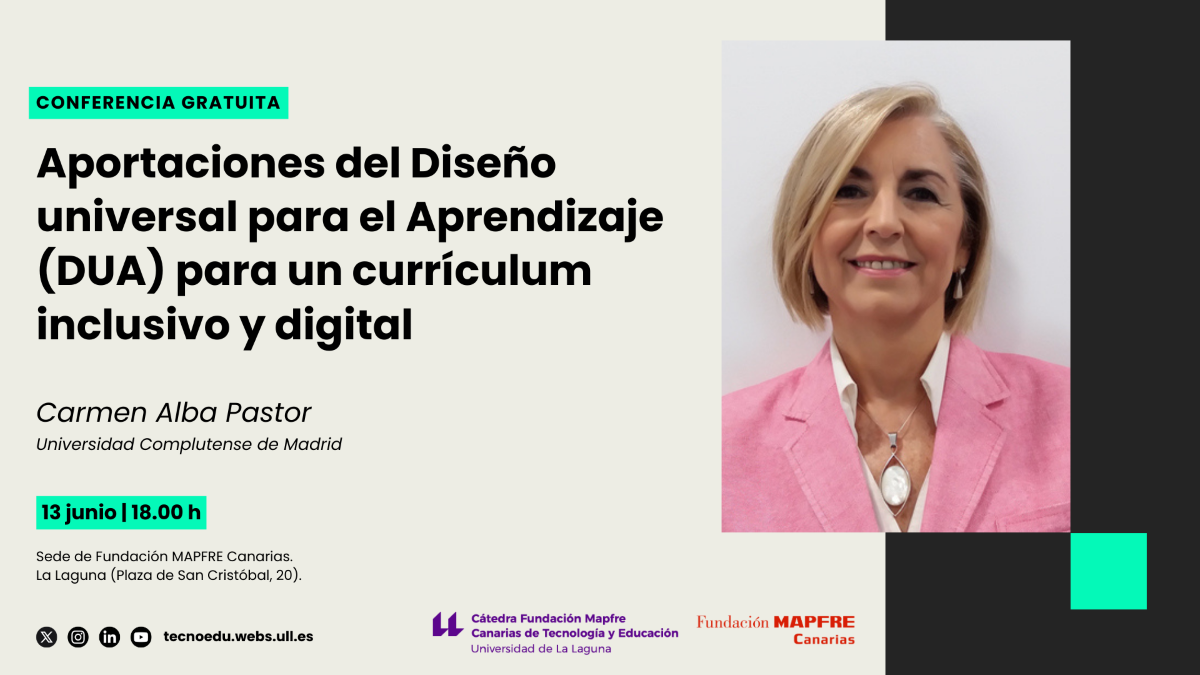 La catedrática de Didáctica y Organización Escolar de la Universidad Complutense de Madrid Carmen Alba Pastor impartirá el próximo jueves, 13 de junio a las 18:00 horas, una conferencia para presentar el modelo del Diseño Universal para el Aprendizaje. La experta ha sido invitada por la Cátedra Fundación Mapfre Canarias de Tecnología y Educación de la Universidad de La Laguna (TECNOEDU) y se celebrará en la Sede de Fundación MAPFRE Canarias, ubicada en la Plaza de San Cristóbal, 20 de San Cristóbal de La Laguna.
