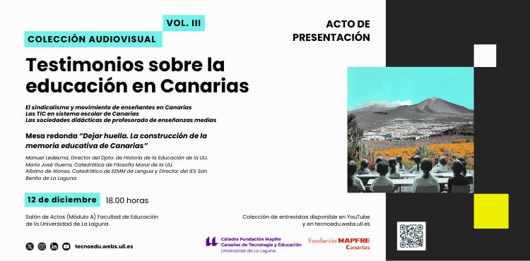 La Facultad de Educación de la Universidad de La Laguna será el escenario de la presentación del tercer volumen de la colección audiovisual Testimonios sobre la educación en Canarias, una iniciativa de la Cátedra Fundación MAPFRE Canarias de Tecnología y Educación (Tecnoedu) que rescata las voces y experiencias de figuras clave en la historia de la educación de las islas; reafirmando su compromiso con la preservación de la memoria educativa.