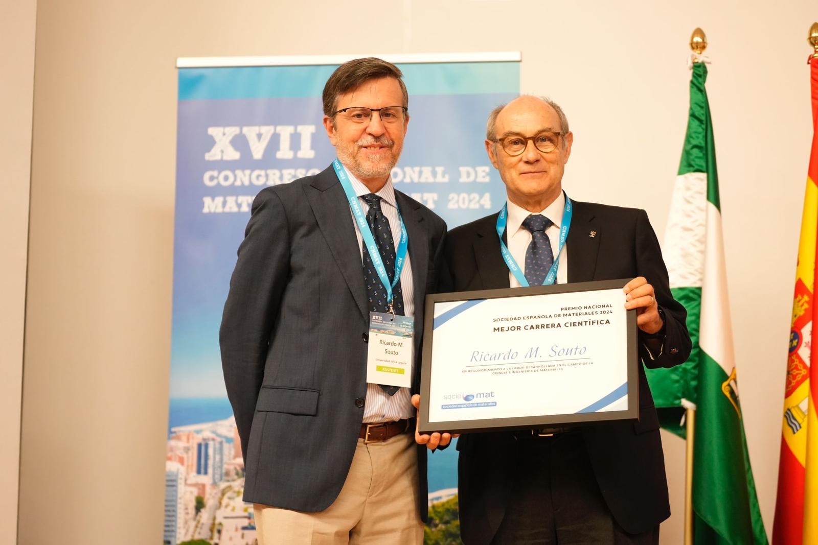 El catedrático del área de Química Física de la Universidad de La Laguna Ricardo Souto Suárez recogió ayer, martes 25 de junio, el premio a la mejor carrera científica que le ha concedido la Sociedad Española de Materiales (Sociemat). El galardón le fue entregado por el presidente de la entidad, el profesor de investigación del Centro Nacional de Investigaciones Metalúrgicas del CSIC Juan José de Damborenea González, en el transcurso del XVII Congreso Nacional de Materiales (CNMAT 2024) que la entidad celebra en el Campus de Teatinos de la Universidad de Málaga hasta el próximo viernes 28.