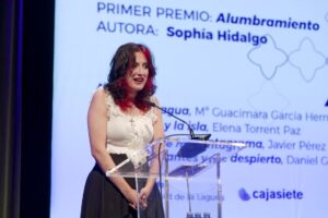 A continuación, se hizo entrega de las distinciones del XIX Concurso Universitario de Relato Breve Día del Libro: los accésit Elena Torrent, Javier Pérez y Daniel García y la segunda premiada, Mª Guacimara García, precedieron a la ganadora, Sophia Hidalgo, por su obra Alumbramiento, en la recogida del galardón. Graduada en Español, Lengua y Literatura por la ULL, y reciente XIV Premio Nacional de Poesía Joven del Ateneo de La Laguna, Hidalgo reconoció que fue su etapa universitaria la que le hizo “ver la literatura, la lectura y la escritura como algo distinto que le generó una pasión arrolladora”.