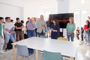 El director de la escuela, en uso de la palabra, acompañado de Norena Martín, en el centro, e Inés Ruiz, a la derecha, más alumnado y profesorado de la escuela.