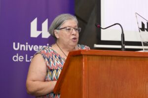 La funcionaria Ana Rodríguez Afonso, de la Sección de Becas, hizo lo propio pero referido al colectivo del personal técnico, de gestión y de administración y servicios, agradeciendo a los compañeros y compañeras los momentos vividos en la universidad y al propio alumnado, del que dijo