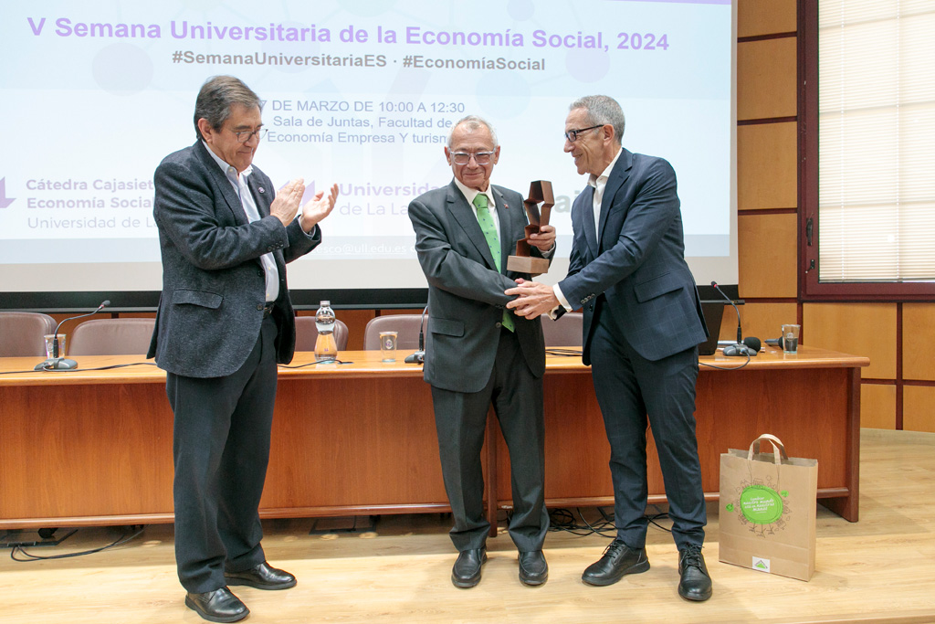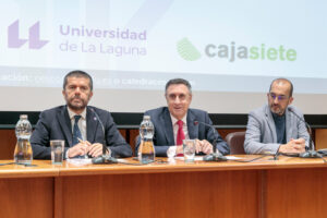 La Cátedra de Economía Social de la Universidad de La Laguna ha celebrado un año más una jornada para presentar las últimas investigaciones en esta materia y defender un modelo económico más sostenible, inclusivo y responsable, a través de actividades de investigación y formación. Así lo aseveraron todos los participantes en la sesión de hoy 7 de marzo, presidida por el rector, Francisco García, quien estuvo acompañado, entre otros, del presidente de Cajasiete, Fernando Berge, entidad que apoya directamente la actividad de la cátedra.