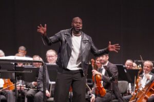 Su entrada en escena fue una buena muestra de esa denuncia de esas muestras de racismo cotidiano que, muscas veces sin malicia, se comenten diariamente: el Thior señaló que le habían colocado un micrófono craneal del cual le había dicho que era “color carne”; le bastó con señalar su rostro para remarcar la palmaria diferencia cromática entre el dispositivo y su piel y arrancar la primera carcajada, pero también la primera reflexión sobre esa discriminación. En su intervención interactuó con la propia orquesta haciéndose pasar por un heterodoxo director, y también relató su vano intento de formar parte de una banda cuando era niño, para poner de manifiesto sus malas aptitudes para la música.