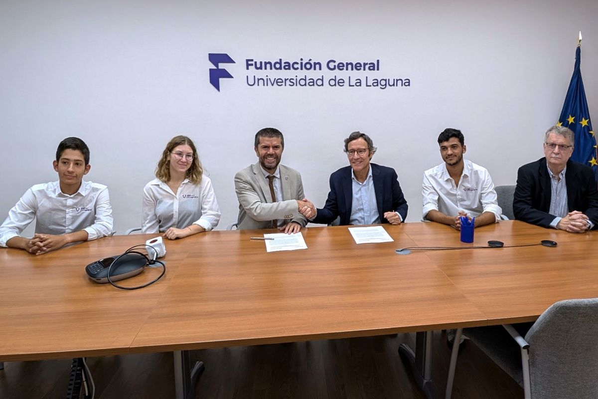 Firmaron el convenio Francisco García, en calidad de presidente del Patronato de la Fundación General de la Universidad de La Laguna, junto a Pedro Brandao de Queiroz Simoes, director gerente de Metropolitano de Tenerife. También estuvieron presentes los estudiantes Enebie Umpiérrez, Carmen Montesdeoca e Imar Suárez, acompañados del profesor Carmelo Militello; el director de mantenimiento de Metropolitano de Tenerife, Ignacio Teresa; y el director gerente de la fundación universitaria, Julio Brito.