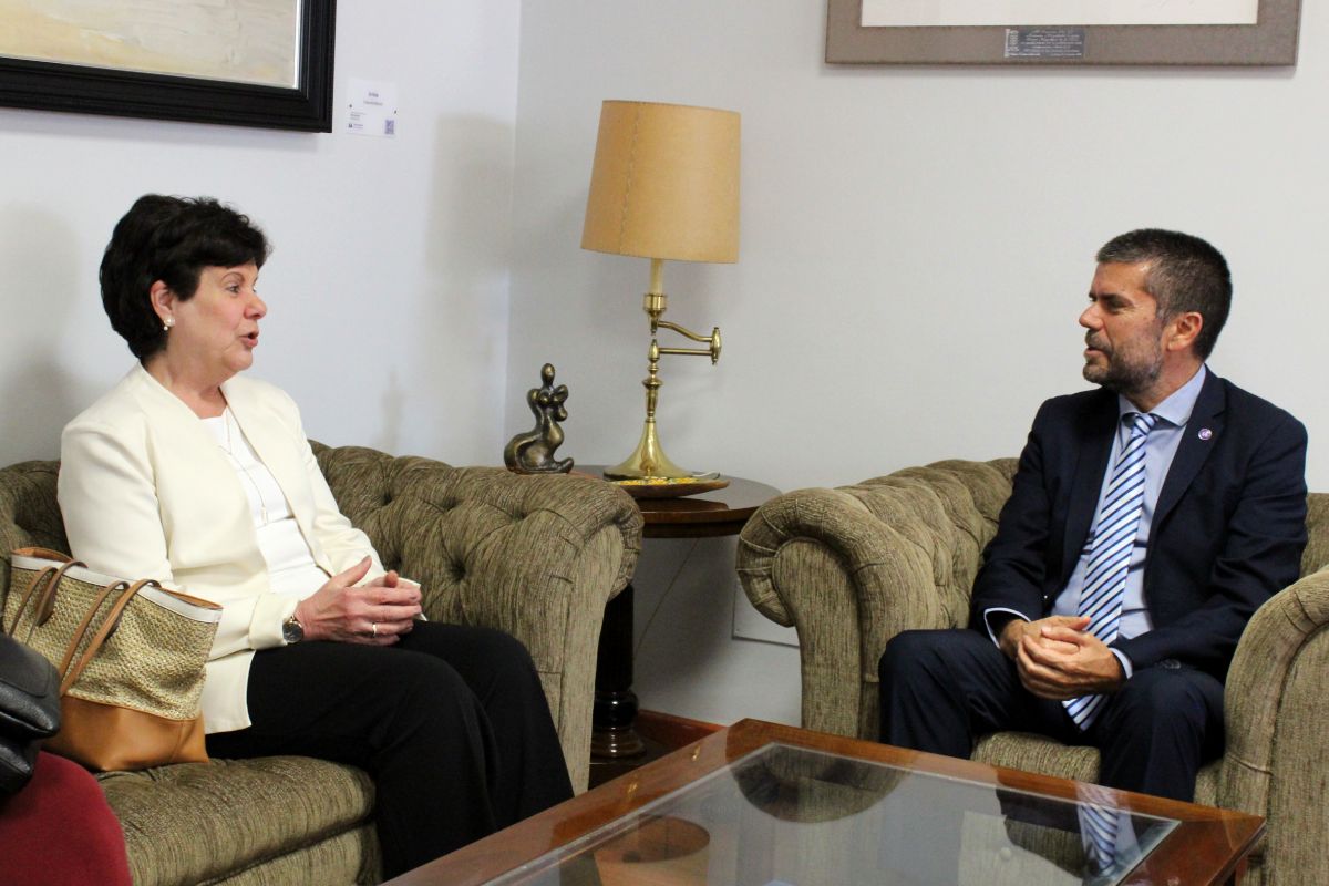 A lo largo de la jornada de hoy, el rector de la Universidad de La Laguna, Francisco García, ha recibido la visita de su homóloga de la Universidad Nacional de Educación de Ecuador, Rebeca Castellanos Gómez, que ha visitado Tenerife con motivo del Campus América y participó ayer en la mesa institucional sobre internacionalización de las titulaciones. Gómez explicó las peculiaridades de su centro, que cumple ahora una década de vida y atiende a una comunidad de 4.000 estudiantes con una oferta académica y científica exclusivamente centradas en el área de Educación.